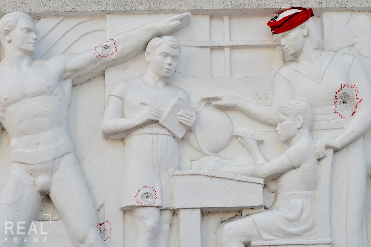 ปูนปั้นรูปประชาชนบริเวณรอบอนุสาวรีย์ประชาธิปไตยเต็มไปด้วยรอยกระสุน