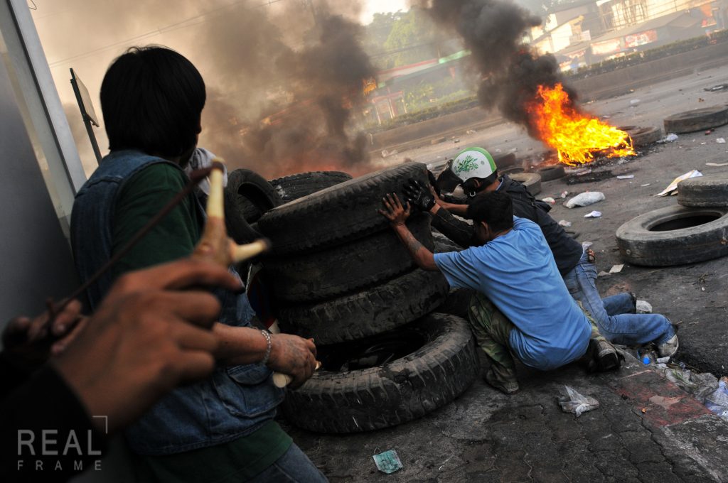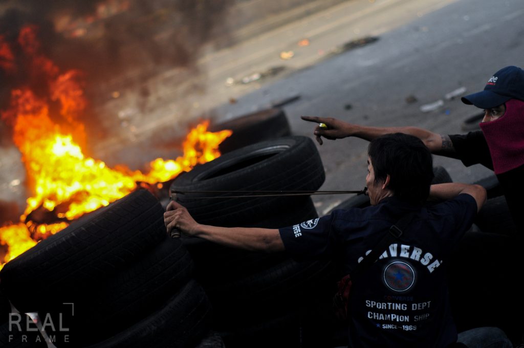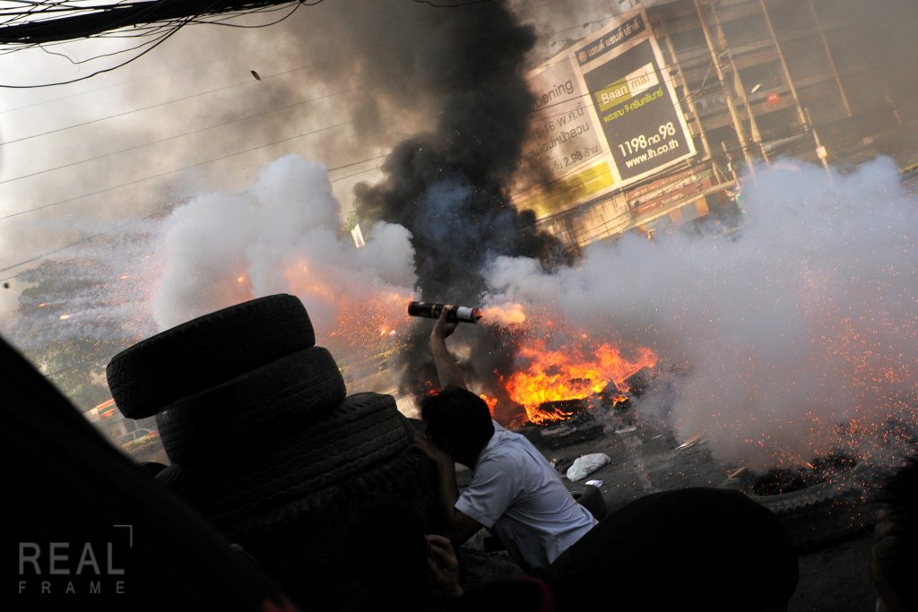 บริเวณพื้นที่บ่อนไก่ ท่ามกลางกองยางรถยนต์และควันดำปกคลุม เท่าที่ตาเห็นผู้ชุมนุมพยายามต่อสู้กับทหารด้วยหนังสติ๊กและบั้งไฟประดิษฐ์