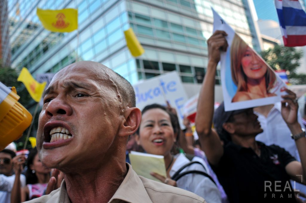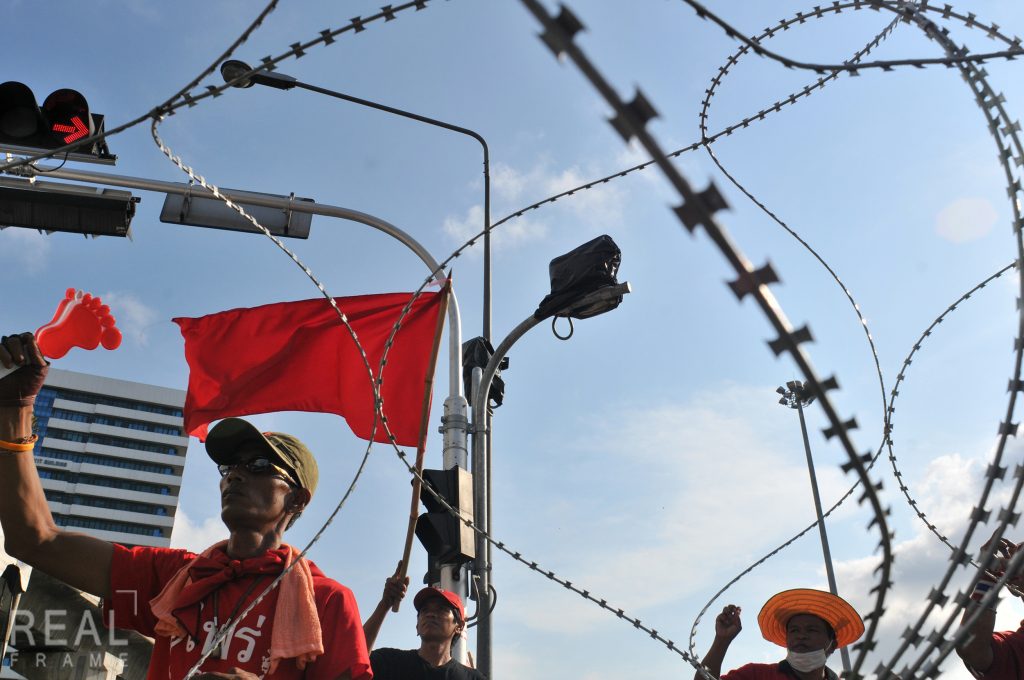 ผู้ไม่เห็นด้วยกับการปิดพื้นที่ชุมนุมในนาม ‘กลุ่มเสื้อหลากสี’ ตะโกนด่าทอจากแยกศาลาแดงหวังส่งเสียงผ่านถนนพระราม 4 ไปยังกลุ่มคนเสื้อแดงอีกฝากถนน