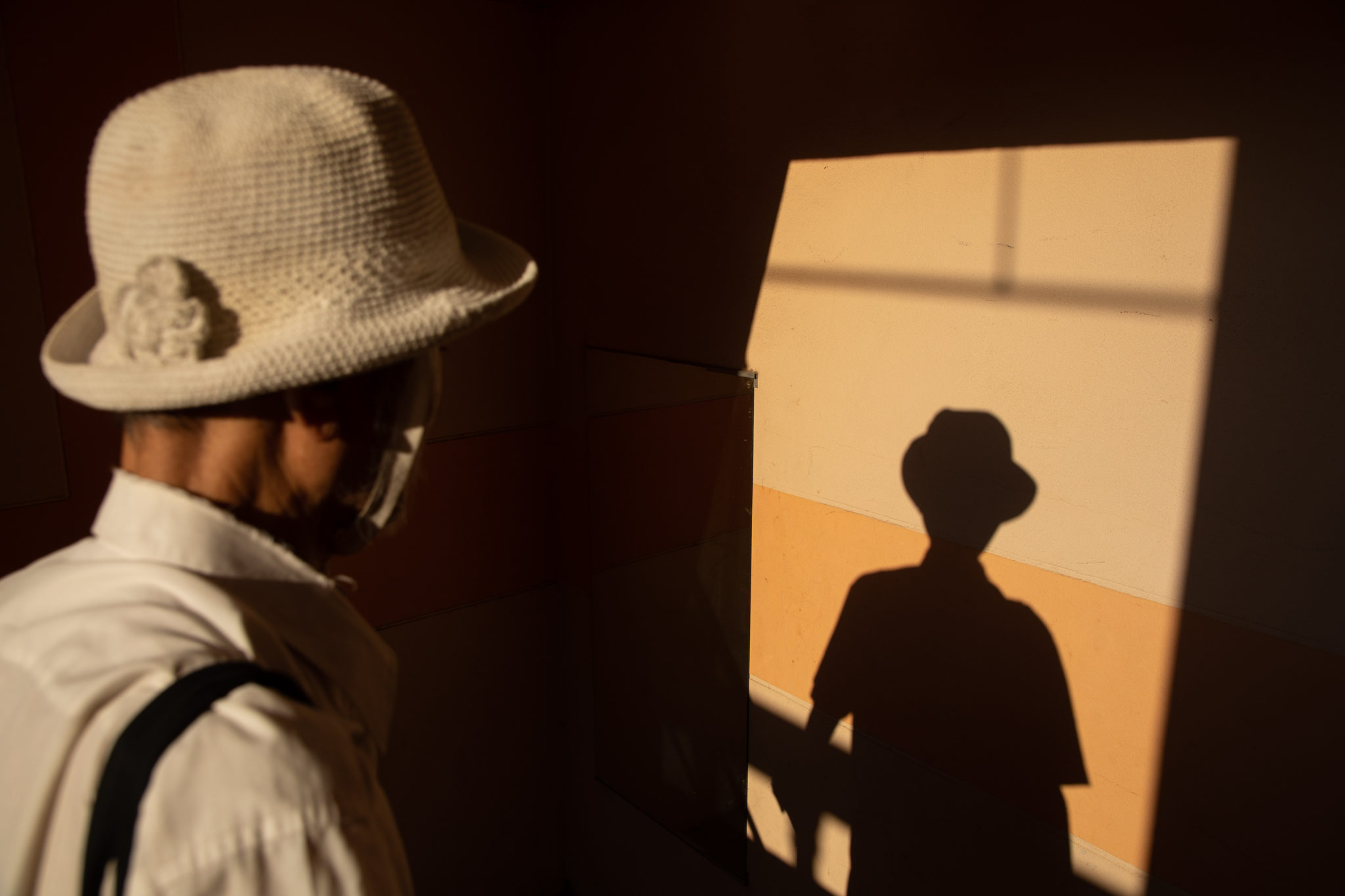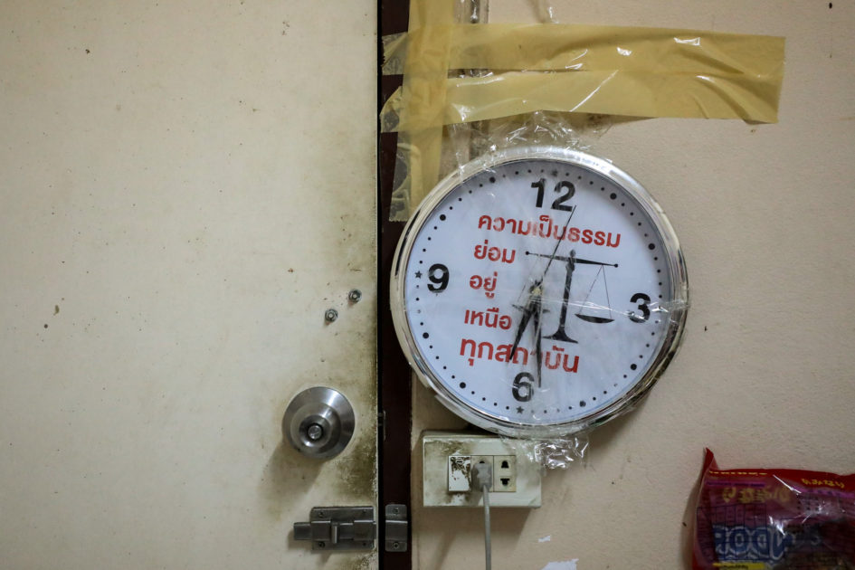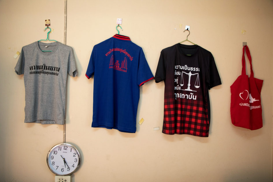 เสื้อสีดำสกรีนข้อความ ‘ความเป็นธรรมย่อมอยู่เหนือทุกสถาบัน’ ถูกแขวนไว้บนผนังสีครีม นวนิยาย The White Rose ถูกวางไว้ที่มุมโต๊ะใกล้กับพิมพ์ดีดเครื่องเก่า กองหนังสือ ถุงผ้า วางระเกะระกะภายในห้องเช่าเล็กๆ ของสมอลล์-บัณฑิต อาร์ณีญาญ์