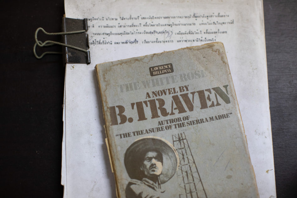 ในห้องพักของนักเขียนสูงวัย นวนิยาย The White Rose บทประพันธ์ของ B. Traven ว่าด้วยเจ้าของบ่อน้ำมันผู้เอารัดเอาเปรียบชาวนาซึ่งแปลค้างไว้ครึ่งเล่มได้รับการแปลอีกครั้งโดย สมอลล์-บัณฑิต อาร์ณีญาญ์