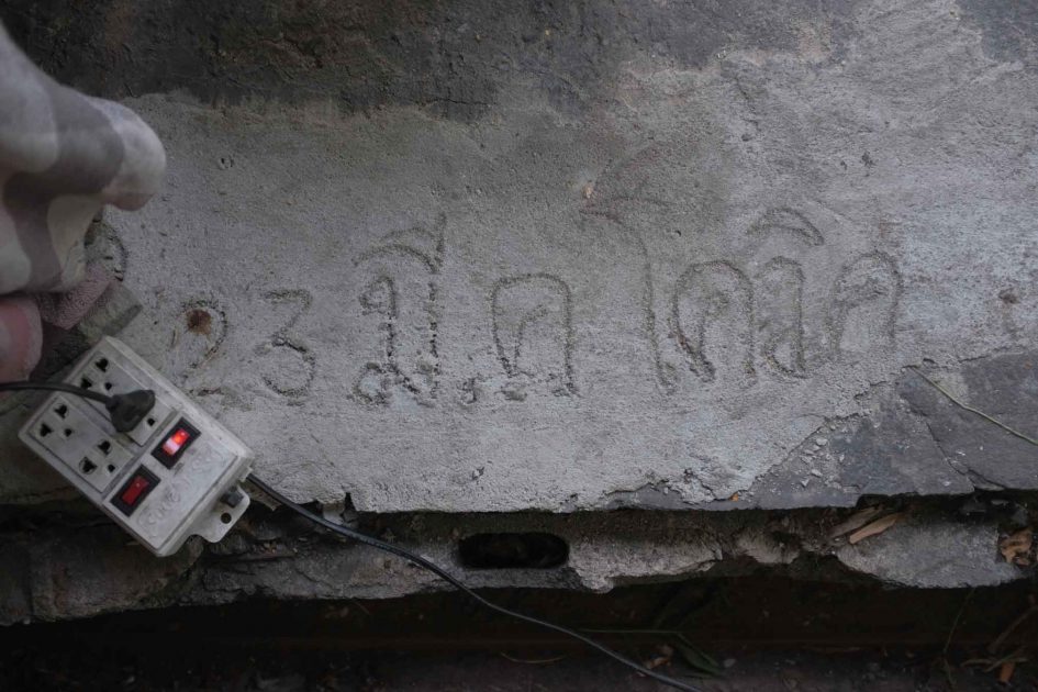 ตัวอักษรถูกเขียนไว้บนพื้นปูนหน้าทางเข้าร้านบุญเลิศบาร์เบอร์ ร้านตัดผมประจำชุมชนโรงหมูเขตคลองเตย เพื่อเป็นสัญลักษณ์ให้นึกถึงวันที่ถูกประกาศให้ปิดร้านเป็นครั้งแรกในรอบ 40 กว่าปี