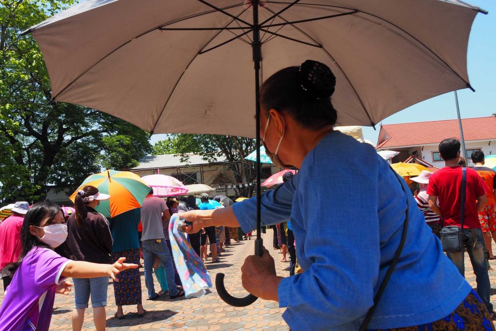 ยังไม่รู้ว่าเขาจะแจกอะไร จะเป็นข้าวสารสักถุง ผัดไทสักห่อ หรือมะม่วงสุก