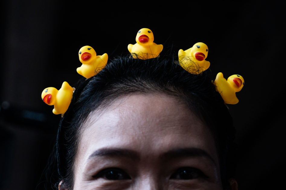 คลิปหนีบผมรูปเป็ดยางถูกประดับไว้บนหัวของผู้ชุมนุม ที่ได้กลายเป็นสัญลักษณ์ยอดนิยมของนักกิจกรรมหลังจากที่เป็ดยางถูกใช้เป็นโล่กันน้ำเฉพาะกิจระหว่างการสลายการชุมนุมด้วยแก๊สน้ำตาและรถฉีดน้ำที่หน้ารัฐสภา