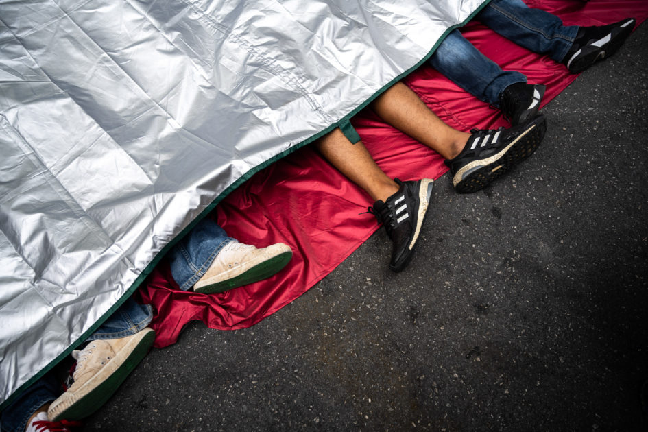 ผ้าสีแดงฉานถูกปูใต้ร่างของนักกิจกรรมเพื่อรำลึกถึงผู้เสียชีวิตจากการสลายการชุมนุมของกลุ่มเสื้อแดงในปี 53 ที่มีผู้เสียชีวิตอย่างน้อย 90 คนและได้รับบาดเจ็บหลักพัน