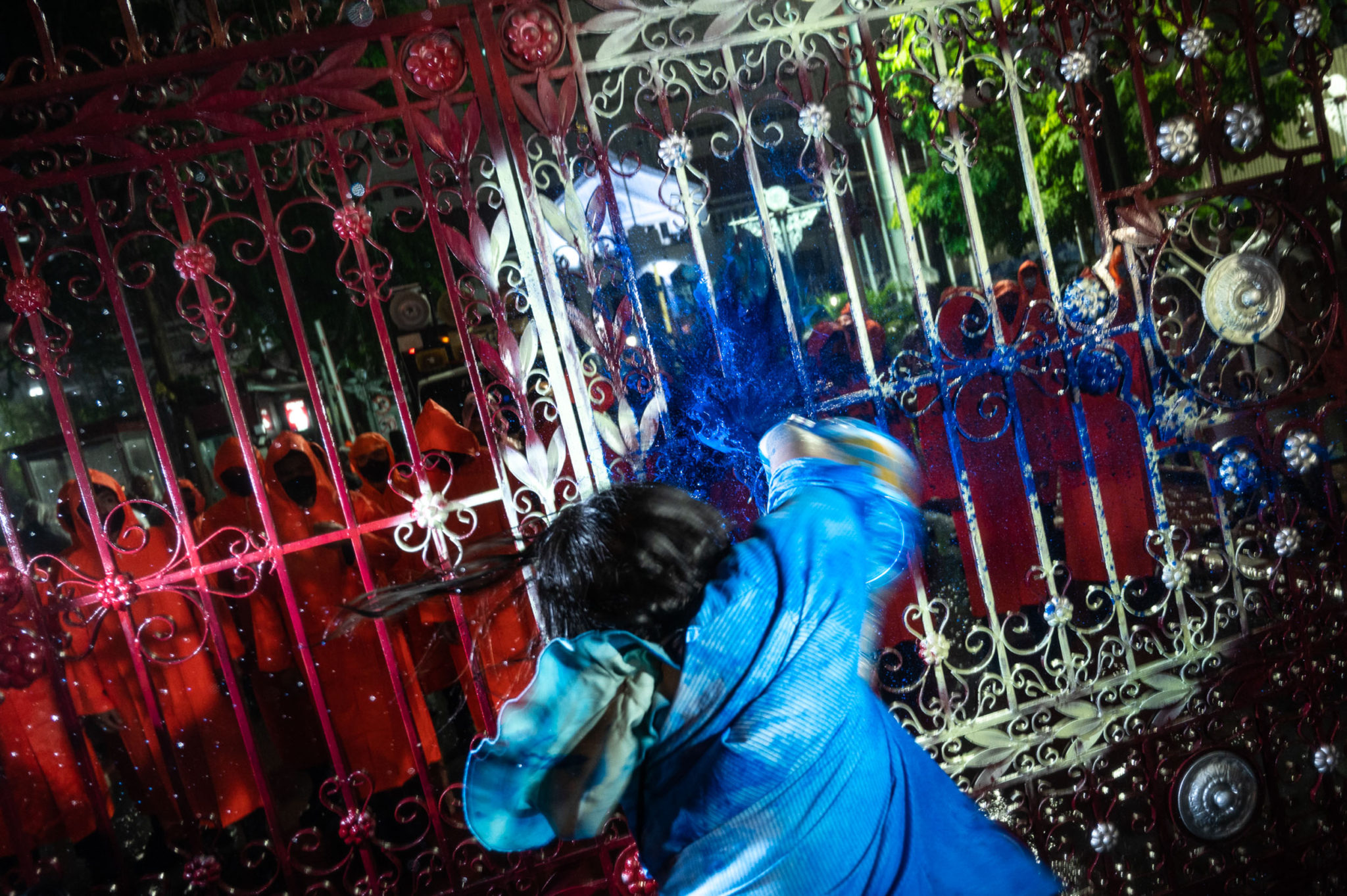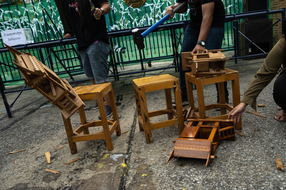 ศาลไม้ถูกทุบตีแตกกระจายด้วยค้อนโดยกลุ่มนักผู้ชุมนุมเพื่อเรียกร้องให้ศาลปล่อยตัวนักกิจกรรมที่ถูกจับกุมตัว ซึ่งความยุติธรรมในระบวนการทางตุลาการเป็นสิ่งหนึ่งที่เหล่าผู้ชุมนุมได้คอยเรียกร้องอยู่เสมอ